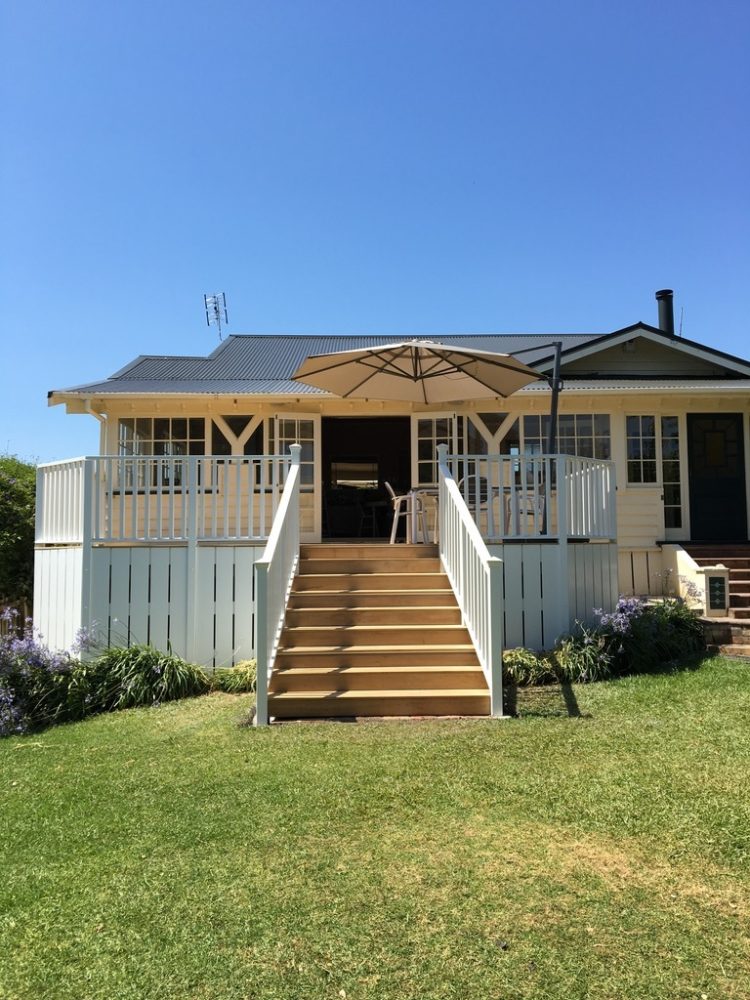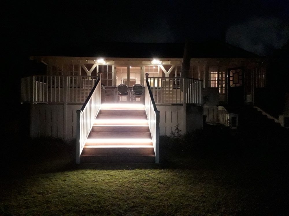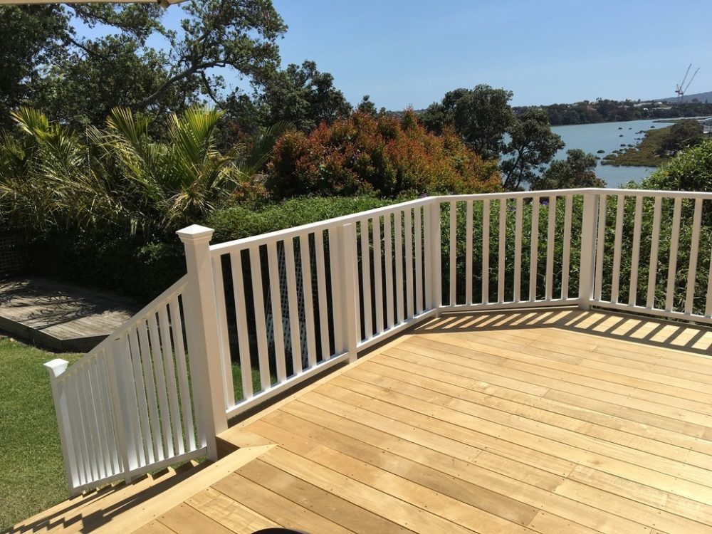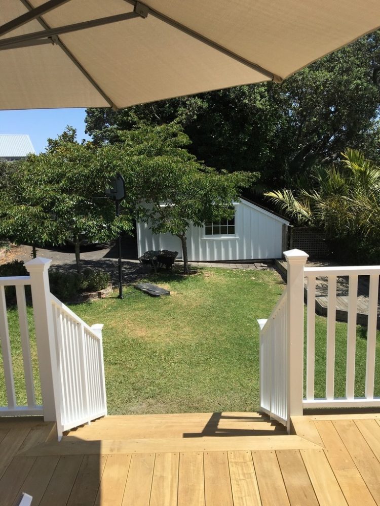 We constructed a new deck using Vitex decking, painted balustrades and skirt, LED rope lighting on the step treads, and post caps on the stair posts, giving a truly grand feel.