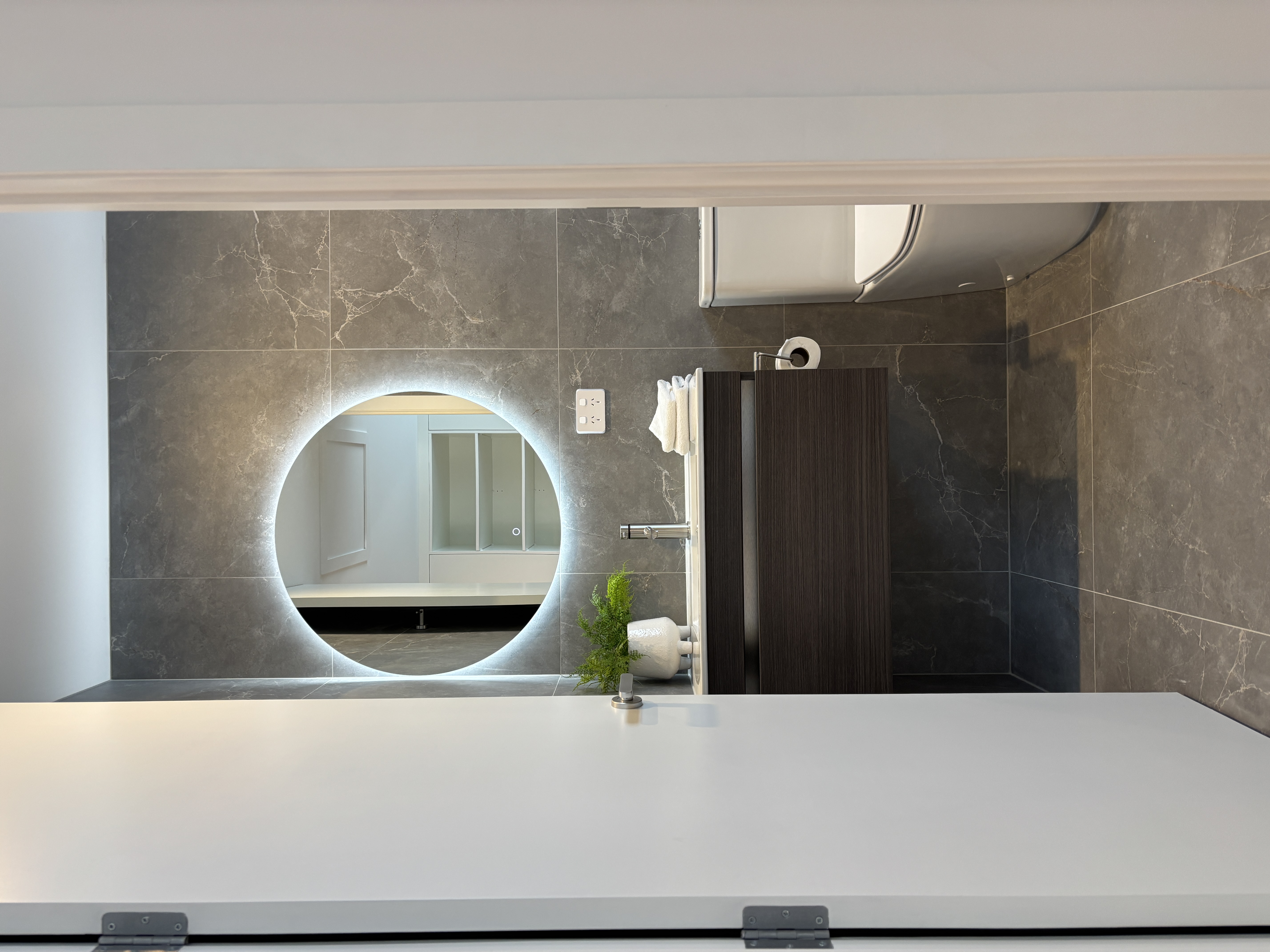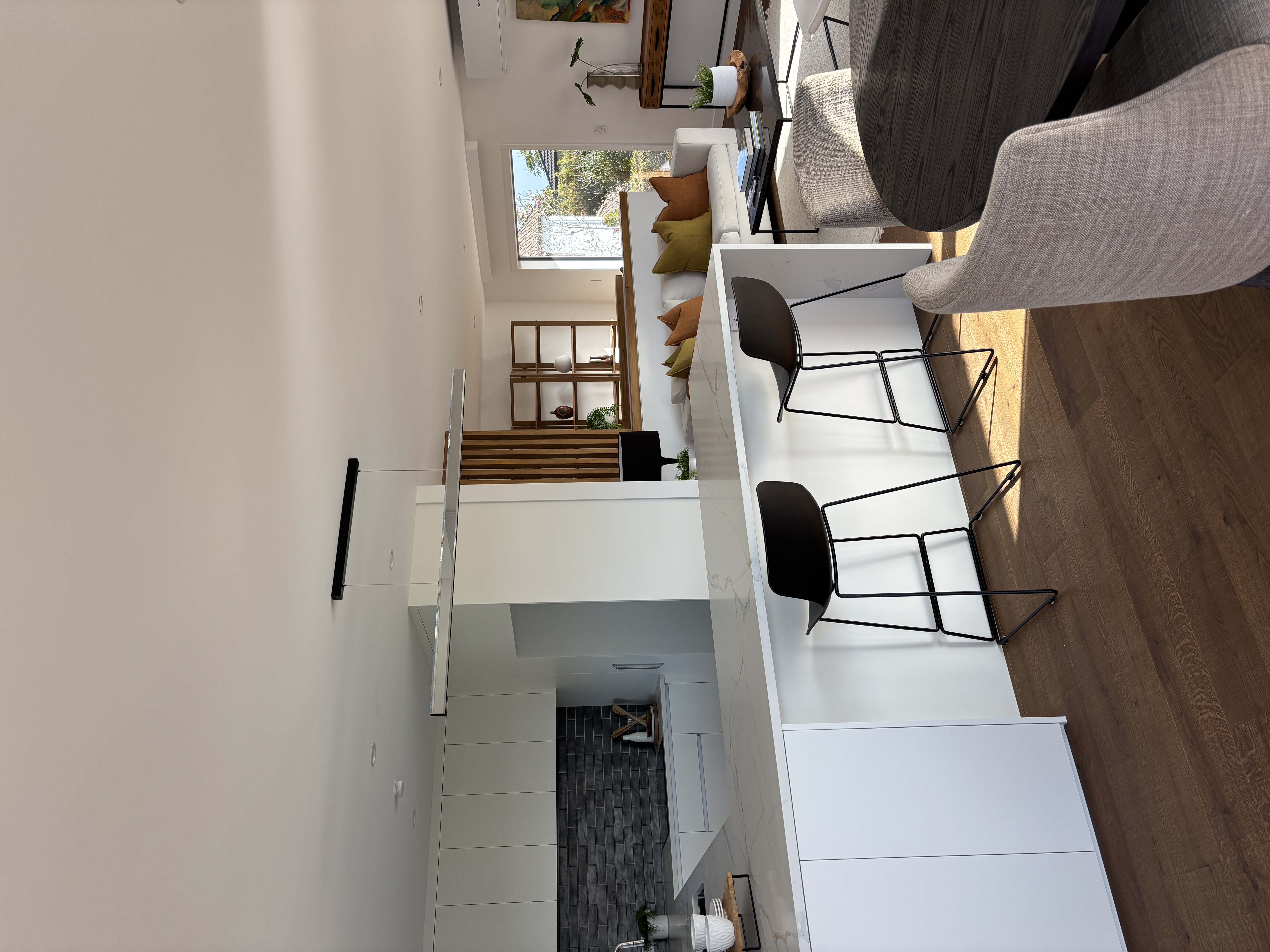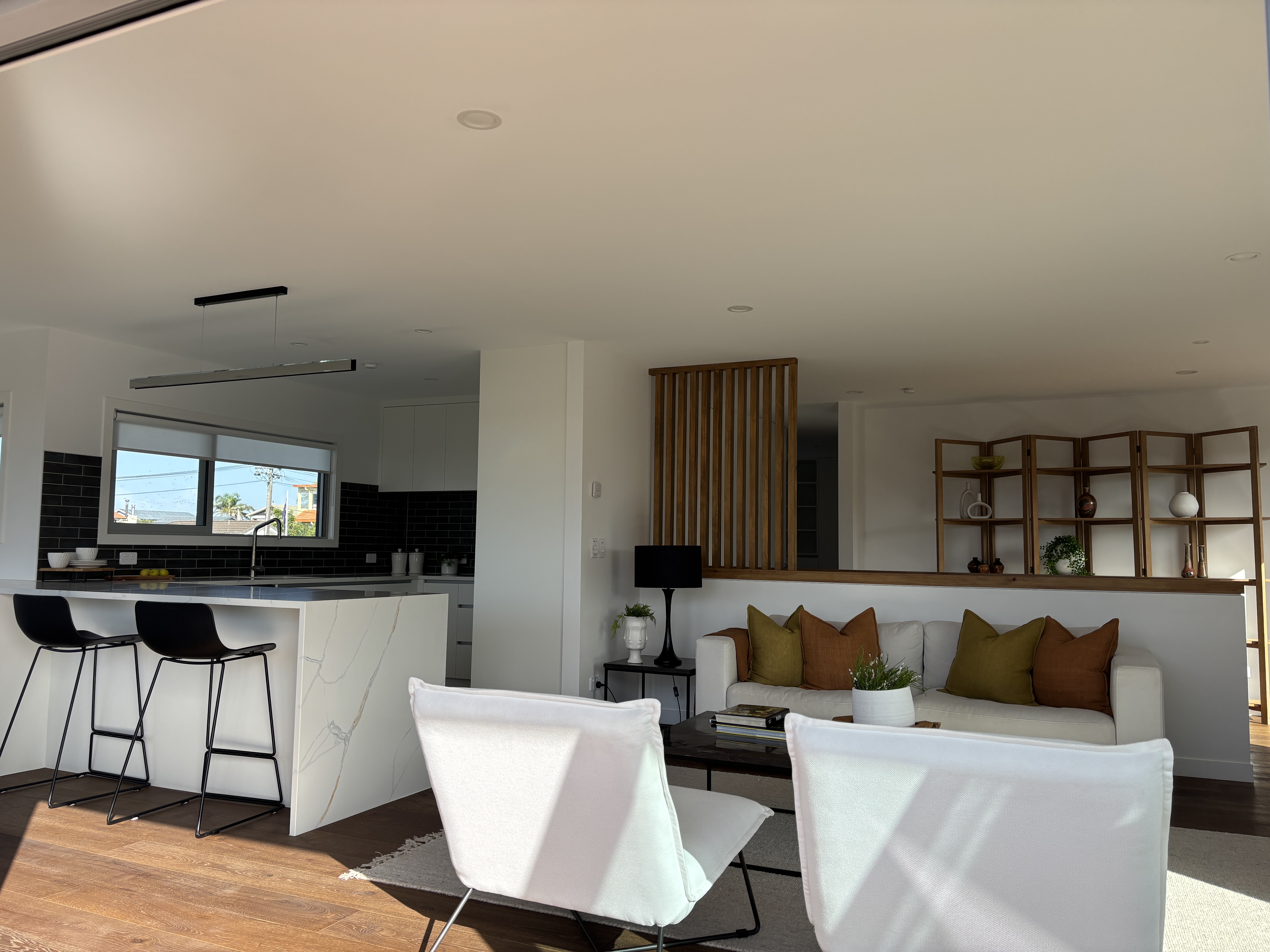 This full home renovation began by taking the space right back to its bones, stripping away the old to make room for a fresh, modern design rooted in natural textures and seamless transitions. A striking cedar screen draws the eye from the ground floor all the way to the first-floor ceiling, creating visual continuity and warmth. Timber flooring, Kwila decking, and soft flowing curtains help tie each space together with a consistent, refined aesthetic. The master suite features custom wall panels with integrated LED lighting, a subtle but luxurious detail that creates a calming retreat. Exterior landscaping was completed alongside the build, allowing the outdoor living area to flow effortlessly from the pergola to the sea view.